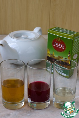 Заварим чай - черный или зеленый. У меня зеленый. И отмерим нужное количество гранатового сока, чайного настоя (желательно его остудить) и сахарного сиропа. Сироп я приготовила заранее - из двух частей сахара и одной части воды (6 ст. л сахара и 3 ст. л. воды положила в кастрюльку и вскипятила). На фото я отмеряла количество продуктов для одной порции (60 мл зеленого чая, 50 мл гранатового сока и 30 мл сахарного сиропа), но готовила 2 порции, и даже этого моей дочери оказалось мало, выпила с удовольствием все до последней капли. Хотя целый гранат ее заставить съесть невозможно, а есть надо, ведь повышение гемоглобина еще никто не отменял, да и витаминами надо запасаться, ведь впереди - зима.