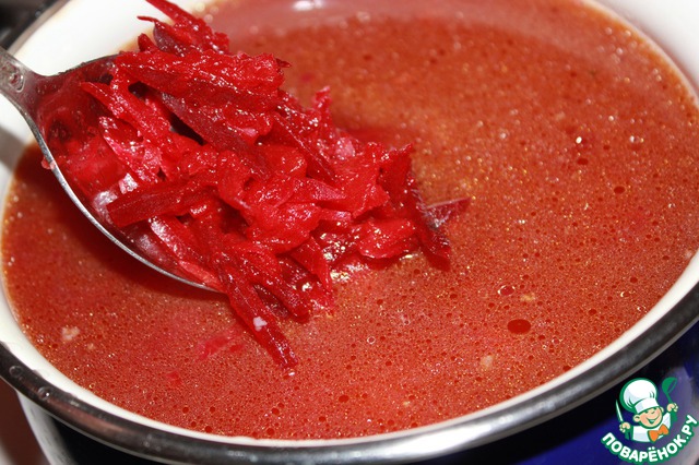 Через 10 минут заправьте борщ подготовленной томатной пассеровкой, добавьте мелко нарезанный чеснок. Доведите до кипения и оставьте настаиваться под крышкой.