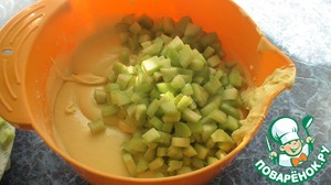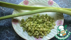 Ревень очистить от кожуры и нарезать не крупными кубиками.