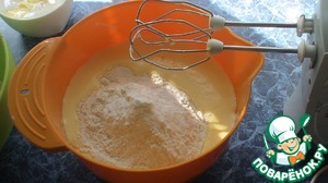 Затем частями добавляем муку (просеянную с разрыхлителем), тщательно вымешиваем.