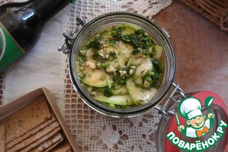Сварить маринад: из воды, уксуса, сахара, соли, растительного масла и раздавить туда чеснок.