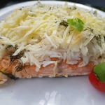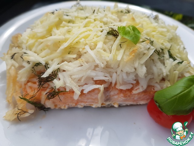 7. выложить рис и рыбку на тарелку. Посыпать тертым сыром и зеленью.