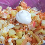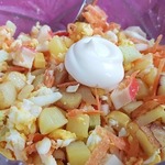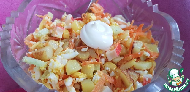 Морковь, яйца отвариваются. Морковь, крабовые палочки, огурчики нарезаются кубиками-все перемешивается. Яйца натираются на терке, добавляется жареная картошка, кукурузка, измельченная зелень. Все заправляется майонезом.