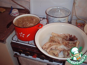 Потом вытаскиваем мясо и отеделяем от костей (очень тщательно, а то потом, если попадет на зуб... )