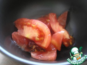 Разрезаем помидор пополам, а потом нарезаем дольками.