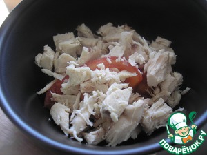 Отварное куриное мясо нарезаем небольшими кубиками и выкладываем на помидор, чуть-чуть солим, перчим.