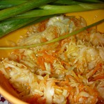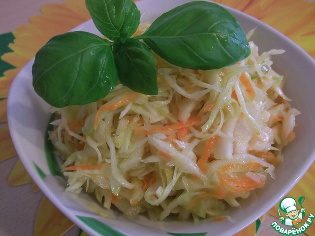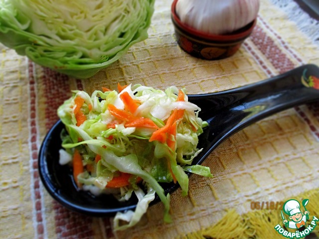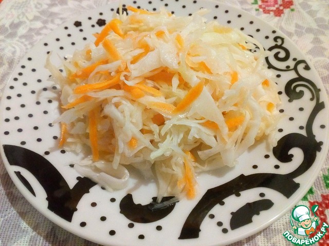 Горячим маринадом залить капусту. Придавить сверху небольшим грузом, на сутки оставить в теплом месте, потом переставить в прохладное. Готова капуста будет примерно через 3 дня, хотя есть можно уже на следующий. Все зависит от капусты - жесткая или мягкая.
