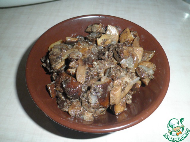 у меня были жареные грибы, но их можно предварительно подготовить - почистить и сварить и обжарить вместе с морковкой.