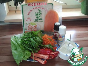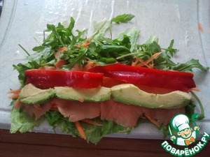 На мокрый лист рисовой бумаги выкладываем салат, морковь, сверху пару пластинок лосося, сверху авокадо по всей длине рулетика и паприку. Свернуть рулетом. -