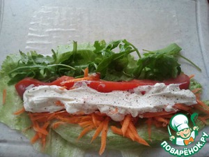 На один край кладем лист салата, сверху немного листьев рукколы, присыпаем морковью, сверху полоску помидора по всей длине бумаги, потом творог. Присолить, приперчить. -