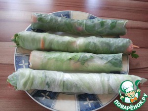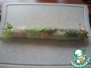 Пока выкладывали начинку, бумага размягчилась. Плотненько заворачивая начинку, свернуть рулетом. Очень важно плотно сворачивать, чтобы при нарезке начинка не вываливалась. Если порвалась рисовая бумага при закрутке, ничего страшного. Берем новый лист бумаги, окунаем в воду, растилаем на рабочей поверхности и заворачиваем в него наш бракованный рулет.