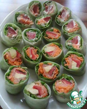 В начинку таким образом можно закручивать все, что пожелаете... сыры, ветчину, колбасы, тонко нарезанные; рыбу/мясо жареную, вареную; любые овощи (которые можно и вкусно есть сырыми) и салаты, шпинат свежий; омлет и т. д.