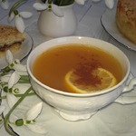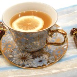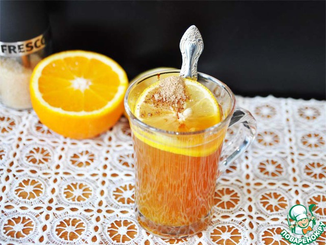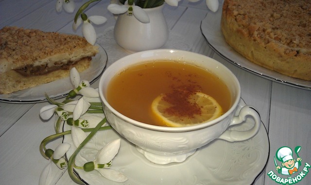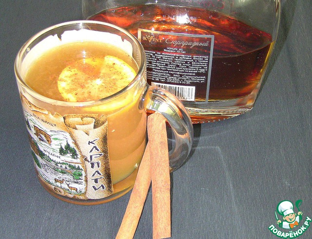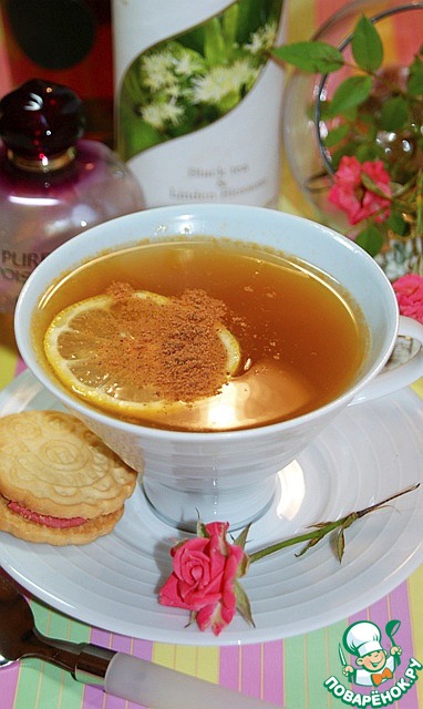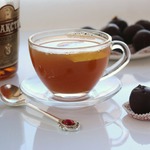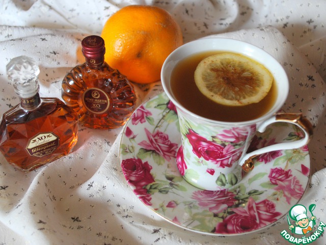 Налить в прогретую чашку, добавить коньяк и кружочек лимона, на который насыпать молотый мускатный орех. Приятного чаепития!