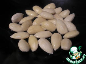 Чтобы с миндаля снять шкурку, нужно залить его кипятком на пару минут. Потом слить воду и обдать холодной водой. После таких водных процедур шкурка снимается легко. Если возникли трудности, процедуру повторить. Очищенный миндаль необходимо подсушить на сковороде на среднем огне 1-2 мин. Измельчим миндаль в кофемолке или с помощью блендера. Можно воспользоваться ножом.