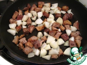 Заложить нарезанные продукты в бульон к гороху, добавить обжаренное мясо с луком и варить еще 10 минут.