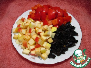Нарезать кубиками яблоки и помидоры, чернослив - соломкой.