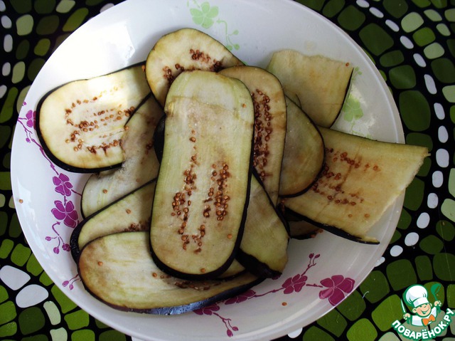 Баклажаны помыть, нарезать тонкими ломтиками, посолить (1 ст. л. без горки) и оставить на 30 минут.