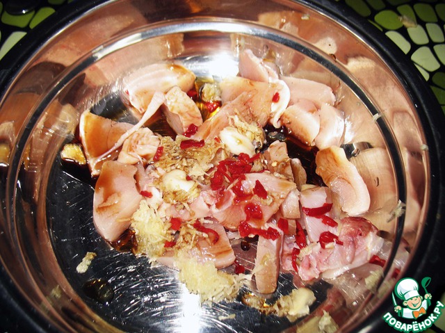Пока стоят баклажаны, маринуем куриную грудку. Я использовала перец чили, тертый на теркe чеснок и соевый соус. Потом ставим вариться рис до готовности, солим по вкусу.