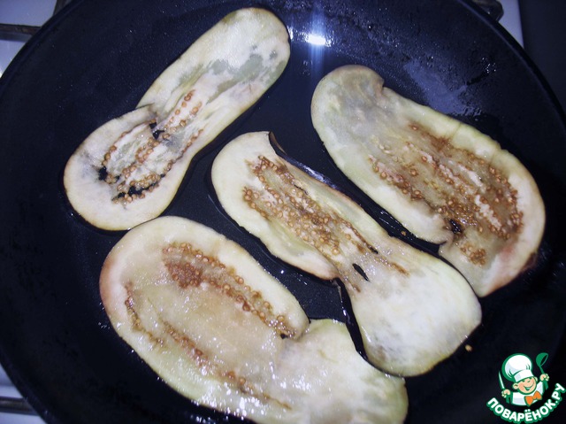 Накалить сковороду, добавить совсем немного подсолнечного масла и обжарить промытые баклажаны с 2-х сторон, примерно по 30 секунд (на сильном огне). Я делаю на сильном для экономии времени.