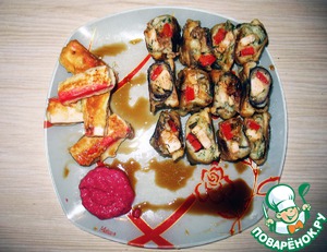 Теперь формируем роллы. Кусочек баклажана смазать рисовой пастой, сверху кусочек курицы и сладкий перчик. Повторям со всеми баклажанами.