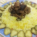 Подавать с отварным рисом. Выкладывать на блюдо сначала рис, а сверху выкладывать мясо.