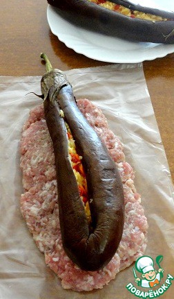 На пищевую пленку укладываем фарш, на него фаршированный баклажан.