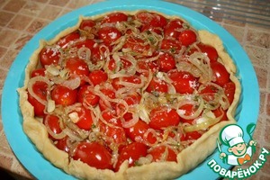 Тесто раскатать, выложить в форму. На тесто выложить помидоры черри и жареный лук, посолить и поставить в духовку на 30-40 минут. -