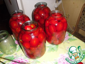 Берем 4 3-литровых банки, стерелизуем, заполняем их помидорчиками, надрезанными крестиком. Заливаем кипяточком и оставляем на 30 мин.