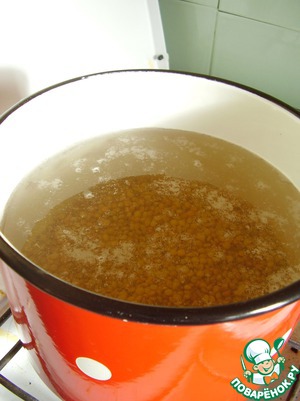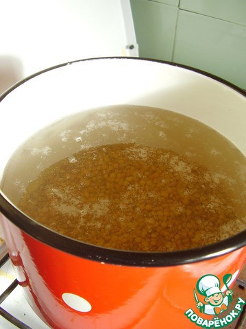 Чечевицу замочим на 2 часа, затем сварим до готовности в 2,5 л воды. Отвар сливаем в отдельную посуду (не выливаем).