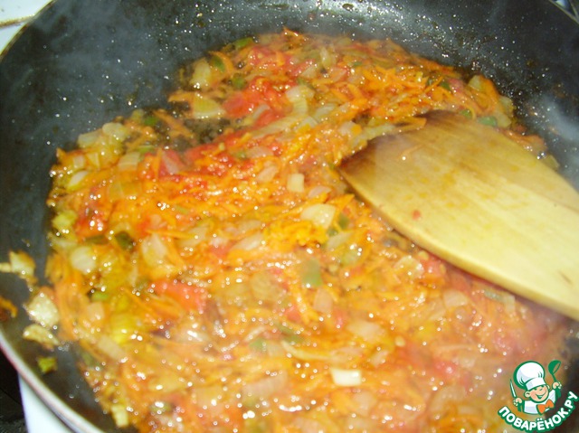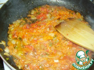 Лук режем кубиками, морковь трем на крупной терке и обжариваем на растительном масле 3 - 4 минуты, добавляем порезанный мелкими кубиками перец чили и очищенные от кожицы и порезанные помидоры (у меня были замороженные серединки, оставшиеся после приготовления вяленых помидоров), посыпаем кайенским перцем. Тушим 5 - 7 минут.