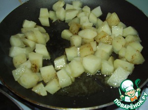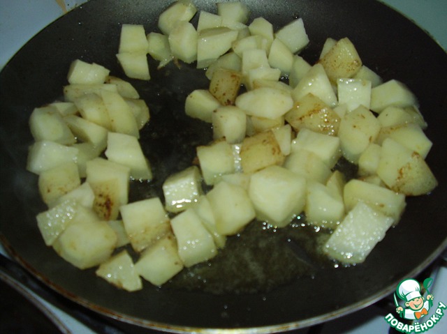 Картофель режем средними кубиками и слегка обжариваем в сливочном масле (чтобы картофельные кубики немного подрумянились и пропитались маслом).
