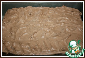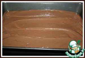 6. Форму смазать, я застелила бумагой, влить тесто, выровнять.