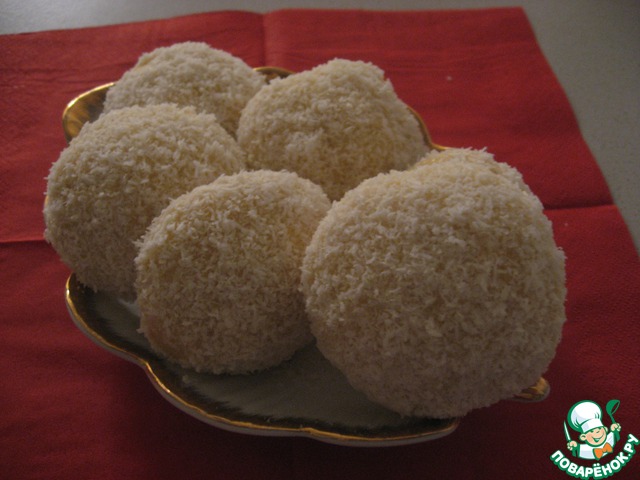 Затем обвалять в кокосовой стружке и уложить на тарелку. Готовое печенье накрыть пленкой и дать постоять пару часов.