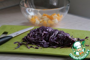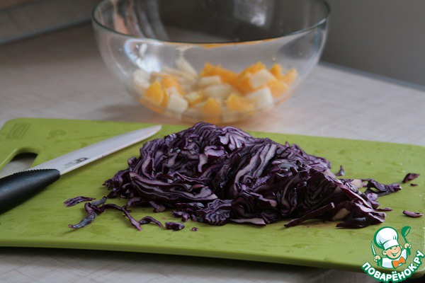 Все предельно просто. Капусту шинкуем тонкой соломкой. Грушу, апельсин, белый сладкий лук нарезаем кубиком.