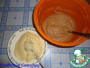Одну треть теста оставляем белой, в две трети теста я добавила просеянное какао.