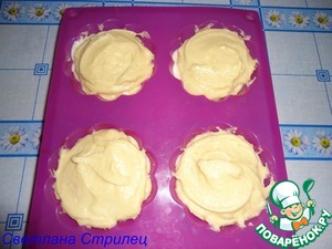 Итак, приготовим первый вариант. В силиконовую форму для кексиков выкладываем примерно 2 столовые ложки светлого теста, сверху на тесто кладем 1,5-2 чайные ложечки начинки из сливочного сыра,