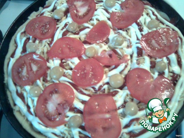 Сверху пиццу полить кетчупом и мойонезом.