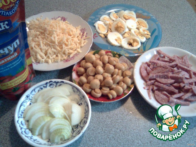 Тем временем порезать кольцами лук, натереть на тёрке сыр, порезать ломтиками колбасу, яйца порезать кружочками. Грибы тоже можно порезать, если большие.