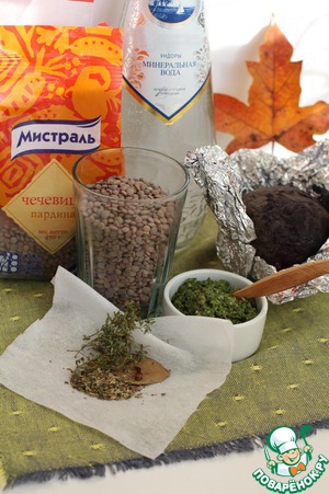 Возьмём чечевицу пардина, у неё отличный ореховый вкус, который идеально подходит к нашему блюду. А теперь об особенности приготовления. Секрет в том, что чечевицу будем варить со специями в минеральной воде и с солью.
