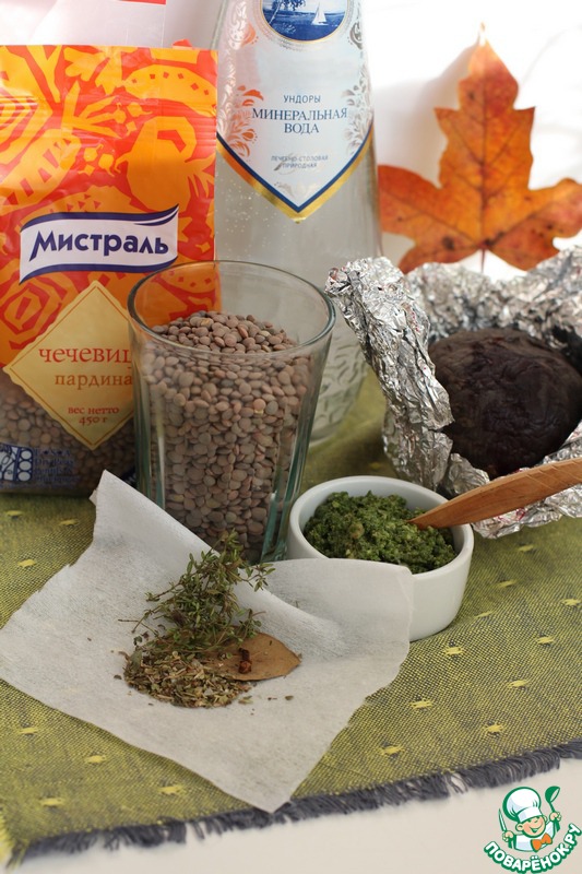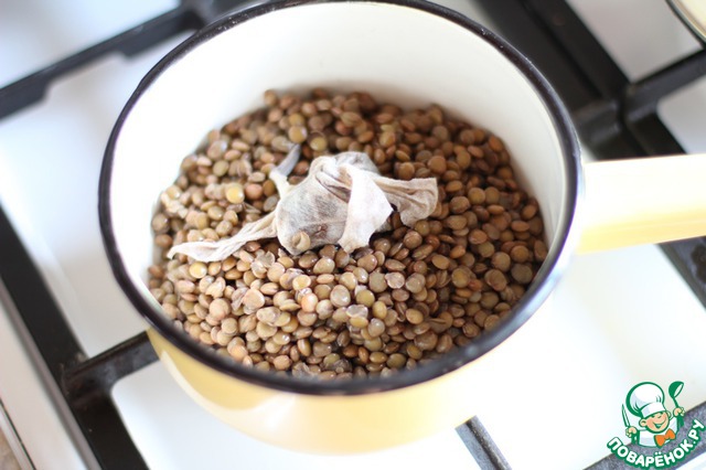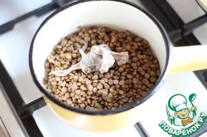Итак, чечевицу промыть, залить минеральной водой, посолить и положить специи (лавровый лист, гвоздику, тимьян, розмарин), завязанные в марлю. Чечевица будет готова через 20 минут. -