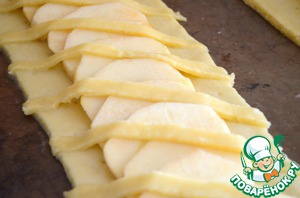 По центру теста выкладываем ломтики яблок внахлест, по всей длине пласта, оставить лишь края 2-3 см.