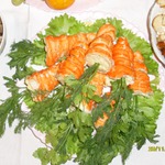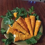 А вот и испеклись наши морковки! Снимаем их с металлических конусов, даем им остыть. С помощью пакета наполняем морковки салатом. Мастерим нашим морковкам хвостики из зелени. Можно также использовать маленькие листики салата.