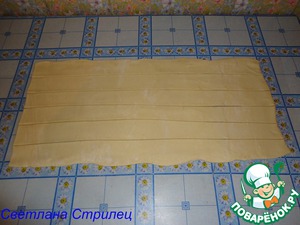 Каждую полосочку теста сворачиваем "рулетиком", а затем раскатываем руками в тонкий жгутик. Жгутик разрезаем пополам (можно сразу 6 полосочек теста разрезать вдоль пополам).