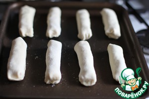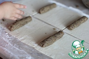 Тесто раскатать в тонкий пласт и разрезать на квадраты, по размеру подходящие, чтобы обернуть чечевичную колбаску один раз. Если используете фило, то смело обворачивайте раза 3.