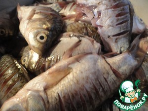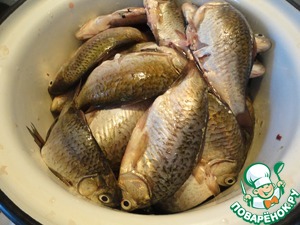 Увидела вчера на базаре маленьких карасей. Размером 10-12 см. Такие малютки продаются довольно редко, но они самые вкусные, т. к. мясо у них сладковатое. Взяла сразу 2 кг. Мой муж карасей крупнее просто не признает. Эта единственная костистая рыба, которую он ест, но часть проблемы с костями я тоже решила. Приготовила я карасей по рецепту, взятому из журнала "Люблю готовить". Провозилась, конечно, я с ними полдня, но результат того стоил!
