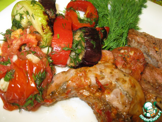 Или открытие осенних дачный выходных. В эти выходные к нам на дачу приехали друзья. Давно их не видела и хотелось угостить их чем-то особенным. Но погода преподнесла нам сюрприз. Дождь лил как из ведра. Просто тропический ливень. Но это не помешало нам отлично провести выходные. Правда шашлык пришлось делать в недостроенной бане. То есть в "полевых условия". Сразу оговорюсь, рецепт овощей, языков и свинины брала у Сталика Ханкишиева.