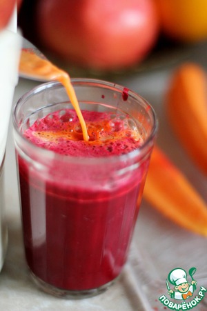Далее почистим свёклу и имбирь, помоем морковь и пропустим через соковыжималку. На стакан сока возьмём три моркови и пол свёклы и 1 см имбиря.