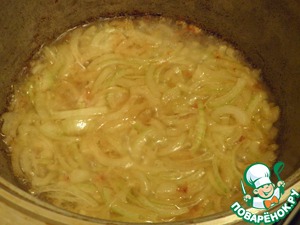 Лук нарезать четверть-кольцами. Обжарить до золотистого цвета и полупрозрачности.