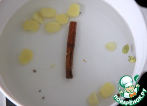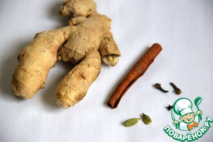 Корень (не весь!, ни в коем случае, только 20г!) очистить, нарезать дольками, добавить палочку корицы, капсулы кардамона и цветки гвоздики. Довести пряности до кипения в воде. Закрыть крышкой, дать настояться 10 мин.