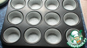 Берем форму для кексов, выкладываем бумажные формочки. Если нет формы для кексов, формочки необходимо поставить в круглую форму для торта. Если нет бумажных формочек, значит, форму для кексов смазать размягченным сливочным маслом и обильно присыпать сухарями.